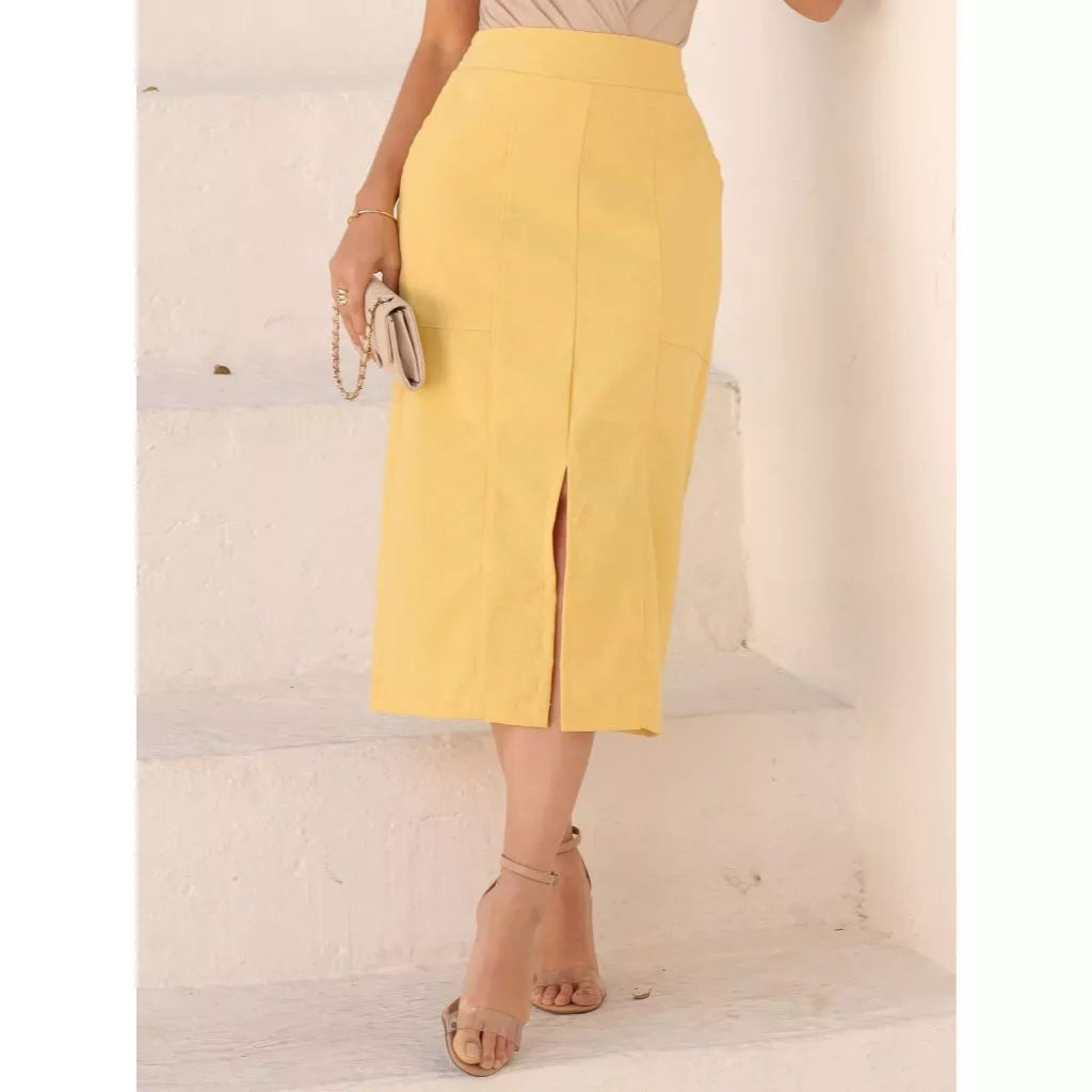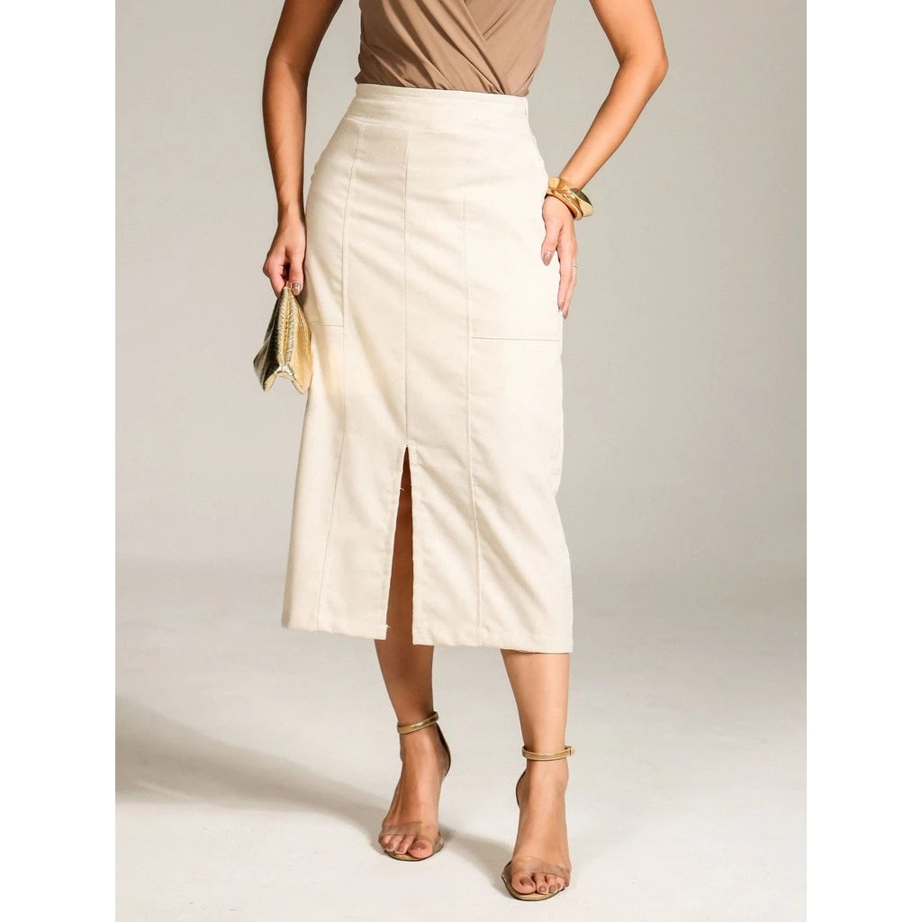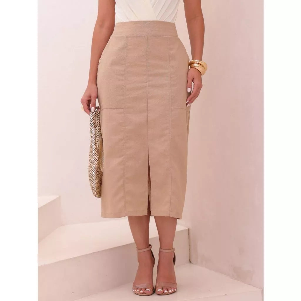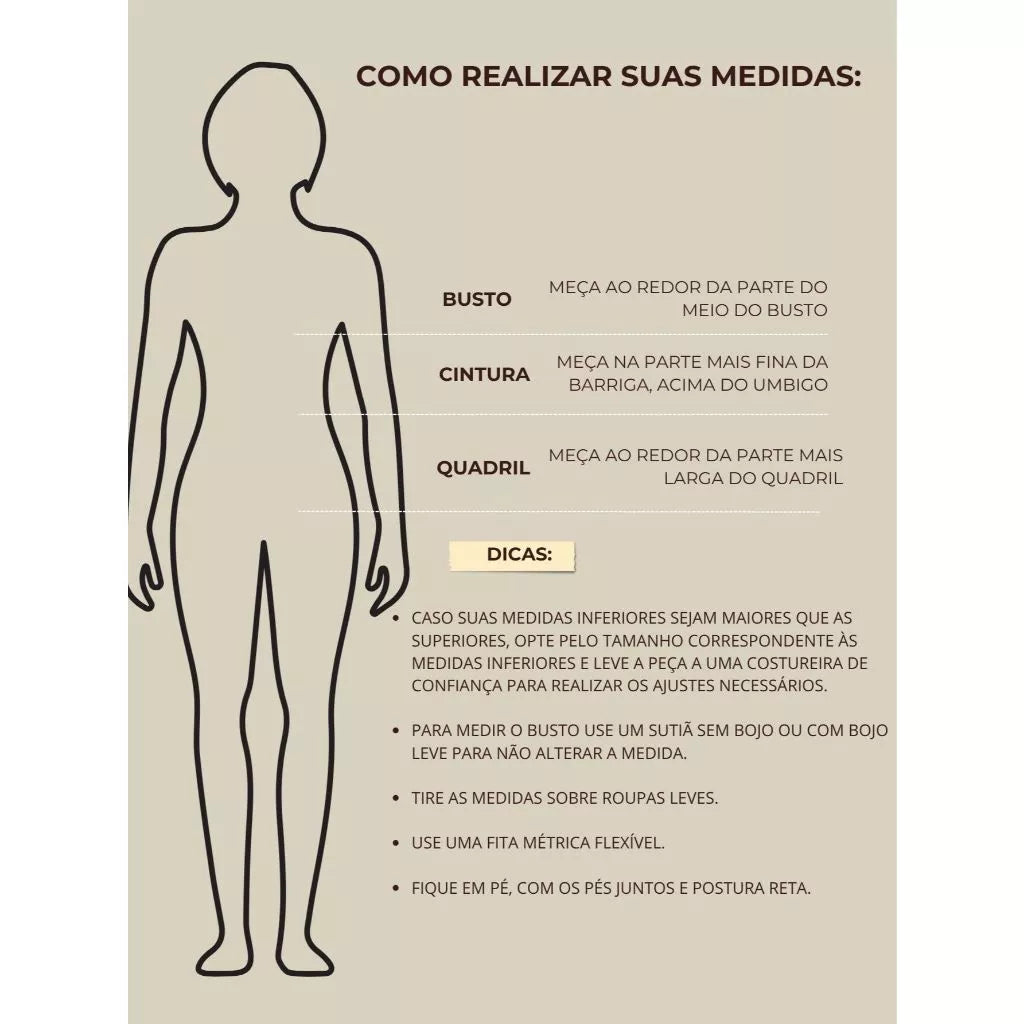 Realce seu estilo com esta saia sofisticada na Bike Tur. Com um caimento impecável, ela apresenta um design moderno que combina conforto e elegância. A cintura conta com elástico na parte de trás para um ajuste perfeito e confortável, enquanto a fenda adiciona um toque de movimento e sensualidade na medida certa. Os bolsos frontais dão um charme extra e praticidade. É extremamente versátil e pode compor looks que vão do casual ao sofisticado. Confira algumas ideias de combinações: Casual Chic Blusa básica de algodão ou viscolycra – Opte por um modelo justo ou levemente solto para equilibrar o volume da saia. Tênis branco ou sandália flat – Para um look confortável e moderno. Bolsa transversal pequena – Para um toque despojado. Elegante & Sofisticado Camisa de linho ou cetim – Use por dentro da saia para marcar a cintura. Scarpin ou sandália de salto bloco – Para alongar a silhueta. Bolsa estruturada e acessórios minimalistas – Para um visual refinado. Estilo Boho Chic Blusa fluida de manga bufante ou cropped – Para um toque romântico. Rasteira de couro ou sandália com amarração – Para um ar leve e despojado. Bolsa de palha e brincos grandes – Para reforçar o estilo boho. Moderno & Urbano Regata canelada ou body ajustado – Para um efeito sofisticado. Bota de cano curto ou mule – Para um toque fashionista. Jaqueta de couro ou blazer oversized – Para um look cheio de personalidade. Esta saia é a escolha ideal para quem busca sofisticação sem abrir mão do conforto. * saia com forro * saia com elástico na cintura na parte de trás Modelo vestindo tamanho (P) Medidas Corporais : P (38) - Busto: 93 Cintura: 73 Quadril:102 M (40) - Busto: 97 Cintura: 77 Quadril:106 G (42) - Busto: 101 Cintura: 81 Quadril:110 GG (44) - Busto: 105 Cintura: 85 Quadril: 114
